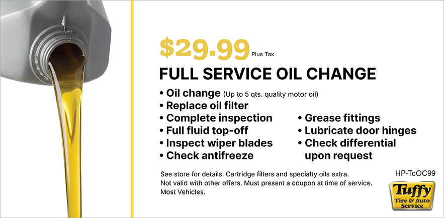 Good only atTuffy Batavia Schedule Service Print coupon Share to Google Share to Facebook Share to Yelp Offer details Full Service Oil Change $29.99 * See coupon for exclusions. Email Coupon First name * Last name * Email address * Sign me up to receive future offers via text from Tuffy Batavia: Via Text Cell/Mobile Phone By clicking "I accept" below, I expressly agree to receive marketing text messages made by or on behalf of Tuffy Batavia to the telephone number(s) I’ve listed above. I understand that I may receive such text messages by the use of Automatic Telephone Dialing Systems (including “Predictive Dialers” or “Autodialers”) and I agree to receive them even if I have registered my number(s) with my state or federal Do-Not-Call list(s). I understand that such text messages will include advertising containing offers for goods or services and that I may revoke this consent at any time by telephone, return text message or by Visiting tuffybatavia.com/stop to unsubscribe. Message and data rates may apply. I also understand that I am NOT required to provide this consent as a condition of purchasing goods or services. I accept View: Text Specials Terms and Conditions with this link.